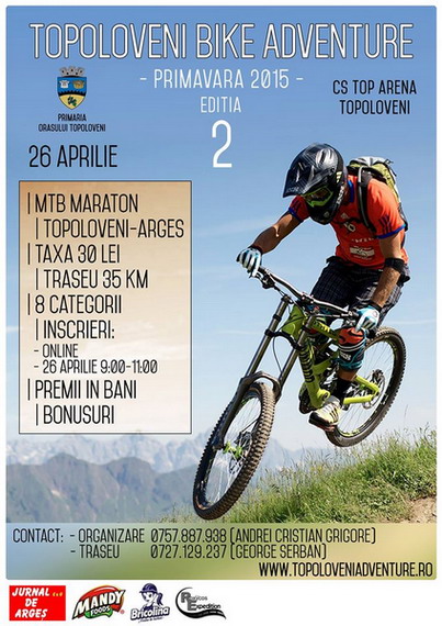 Primaria Orasului Topoloveni si C.S. Top Arena Topoloveni organizeaza duminica, 26 aprilie 2015, incepand cu ora 9:00, editia cu numarul 2 a concursului de ciclism Topoloveni Bike Adventure, adresat deopotriva amatorilor si sportivilor legitimati.