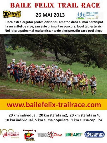 Clubul Sportiv XTERRA Sport Bihor, in parteneriat cu Federatia Romana de Atletism, va invita duminica, 26 mai 2013, la prima editie a Crosului Baile Felix (Baile Felix Trail Race).