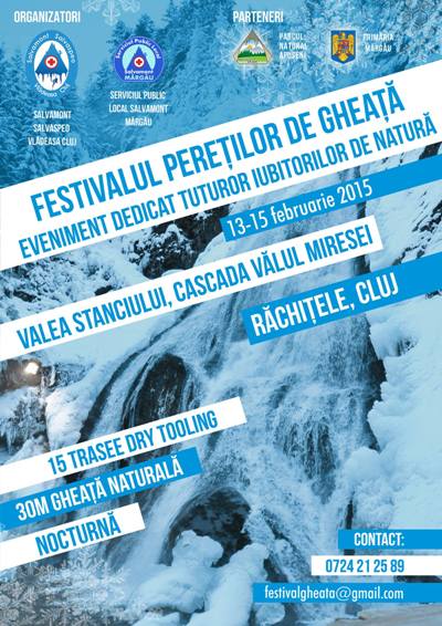 Salvamont Salvaspeo Vladeasa Cluj, in parteneriat cu Primaria Margau si Parcul Natural Apuseni organizeaza in perioada 13-15 februarie 2015, la Cascada Valul Miresei din Rachitele (judetul Cluj), prima editie a evenimentului Festivalul Peretilor de Gheata.
