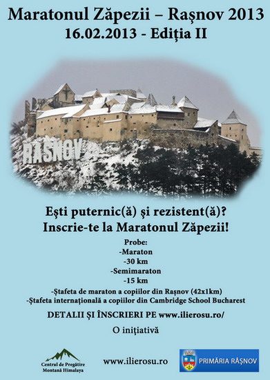 Pentru alergatorii carora maratoanele traditionale li se par deja plicticoase, un maraton la care caldura nu va fi o problema. Este vorba despre Maratonul Zapezii 2013, care se va desfasura in data de 16 februarie 2013 in zona Rasnovului si a Muntilor Bucegi, organizat de catre Asociatia Club Sportiv Eco Alpin, prin Centrul de Pregatire Montana Himalaya.