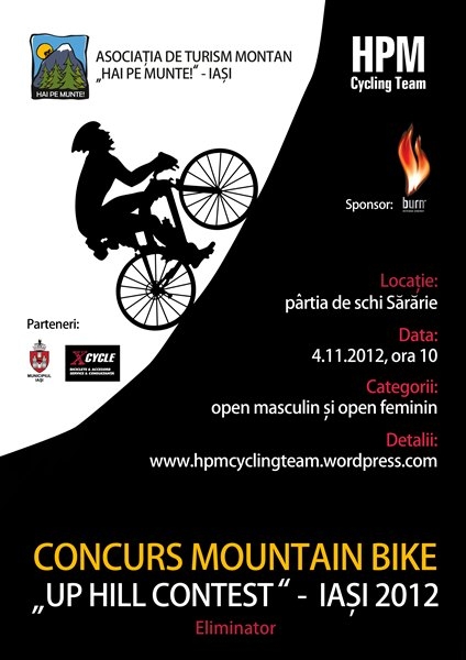 Duminica, 4 noiembrie 2012, pe partia de ski Sararie din Iasi va avea loc a doua editie a concursului de ciclism (mountain bike) "Up Hill Contest", in organizarea Asociatiei de Turism Montan "Hai pe munte!" Iasi si a HPM Cycling Team.